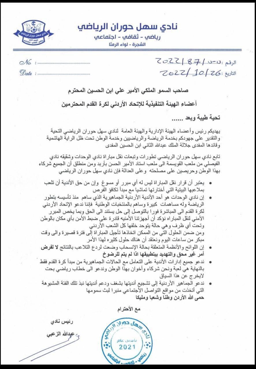 نادي سهل حوران مخاطباً سمو الأمير: من حق الوحدات اللعب على ملعبه البيتي!! صورة