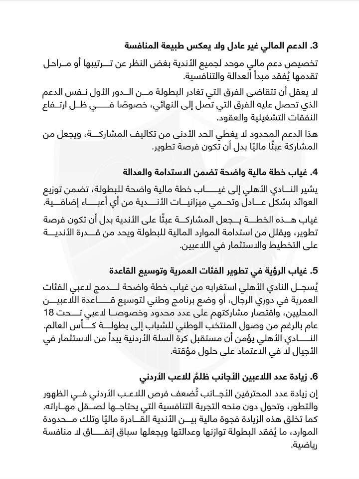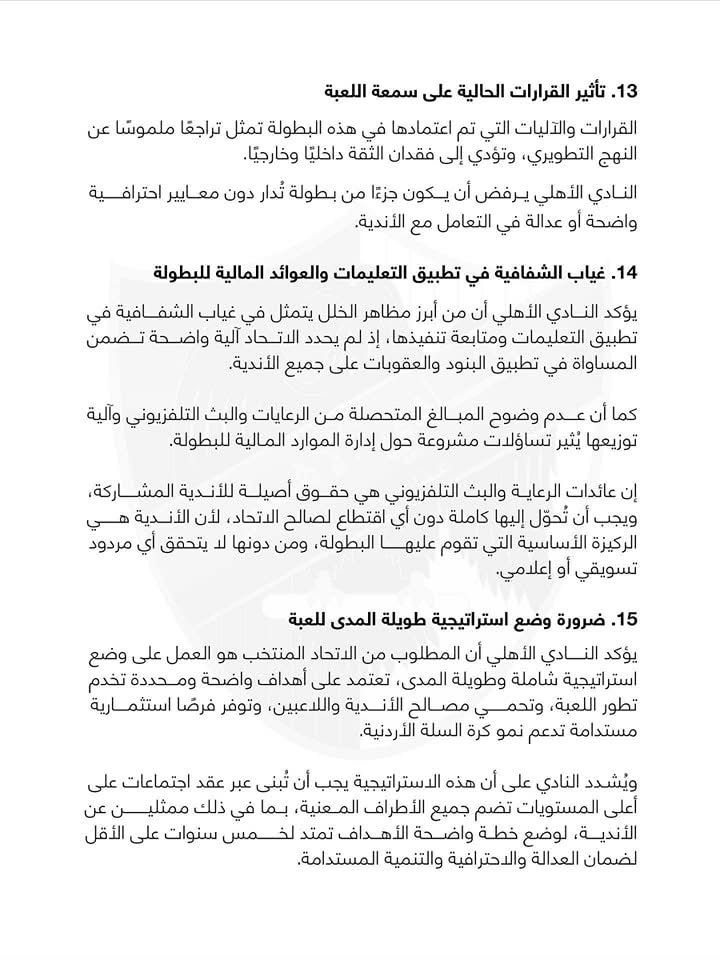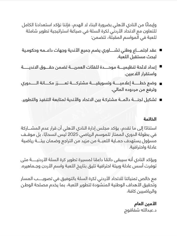وأكد الأهلي أن قراره “ليس انسحابًا بل موقفًا مسؤولًا” يهدف إلى حماية اللعبة وضمان بيئة تنافسية عادلة، مشددًا على استعداده للتعاون مع الاتحاد في وضع استراتيجية تطوير شاملة لكرة السلة الأردنية خلال المواسم المقبلة.