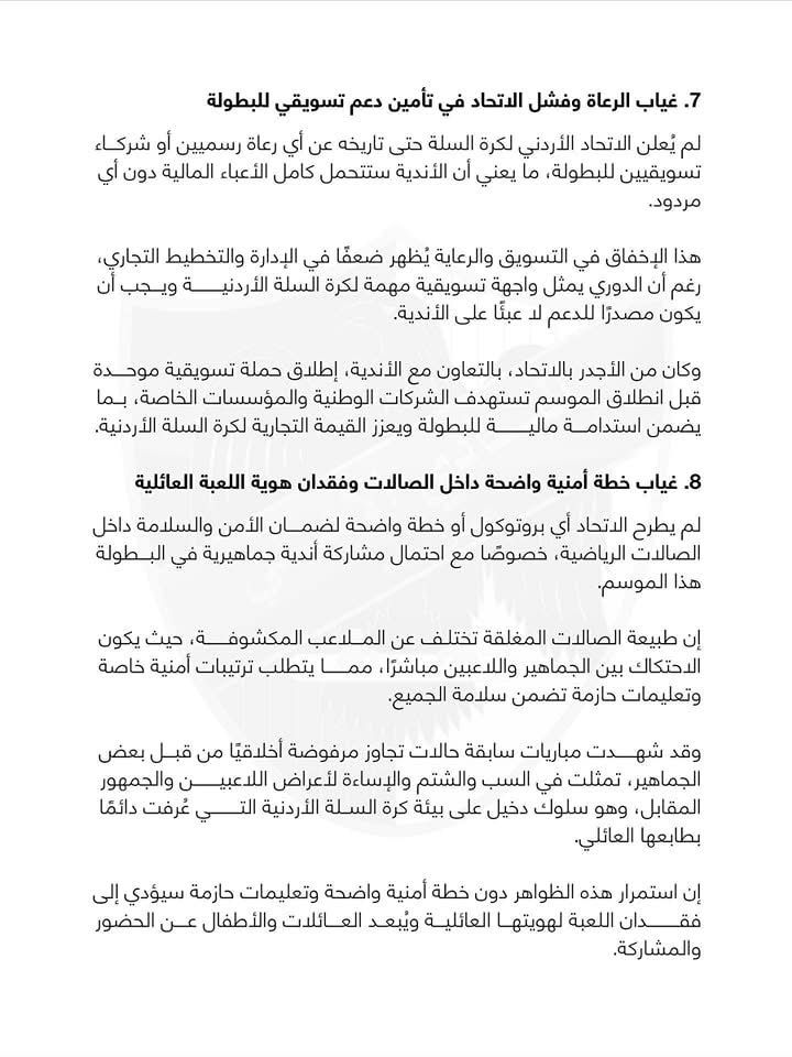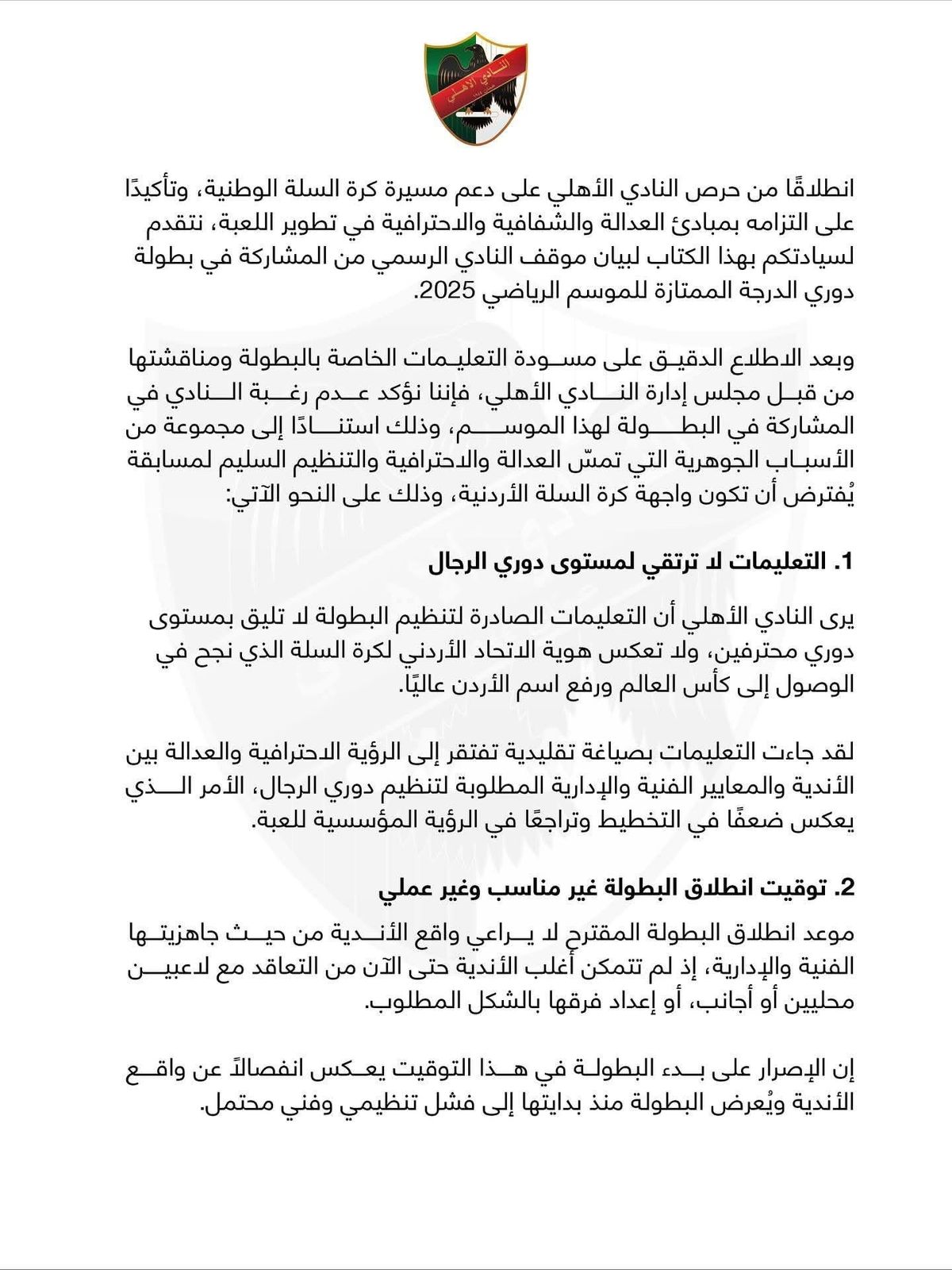 وأوضح النادي، في كتاب رسمي موجه إلى الاتحاد الأردني لكرة السلة، أن التعليمات الخاصة بالبطولة “لا ترتقي لمستوى دوري محترفين”، مشيرًا إلى وجود “قصور تنظيمي ومالي وتسويقي”، وغياب العدالة في الدعم المقدم للأندية، إضافة إلى “توقيت انطلاق غير مناسب وغياب خطة أمنية وتسويقية واضحة”.