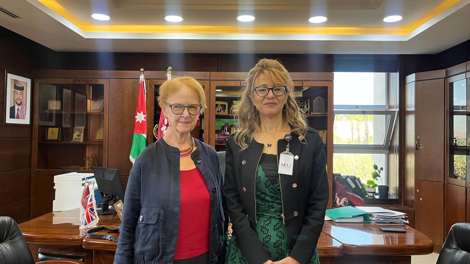 وخلال لقائها مع رئيسة جامعة الشرق الأوسط الأستاذة الدكتورة سلام المحادين، جرى بحثُ سير عمل مشروع "دربُنا"، واستعراضُ تطورات برنامج الدكتوراه البريطاني المستضاف، إلى جانب مناقشة آليات تطوير التعاون البحثي المشترك، بما يُسهم في تمكين الباحثات والباحثين وتوسيع آفاق الشراكة الأكاديمية الدولية.