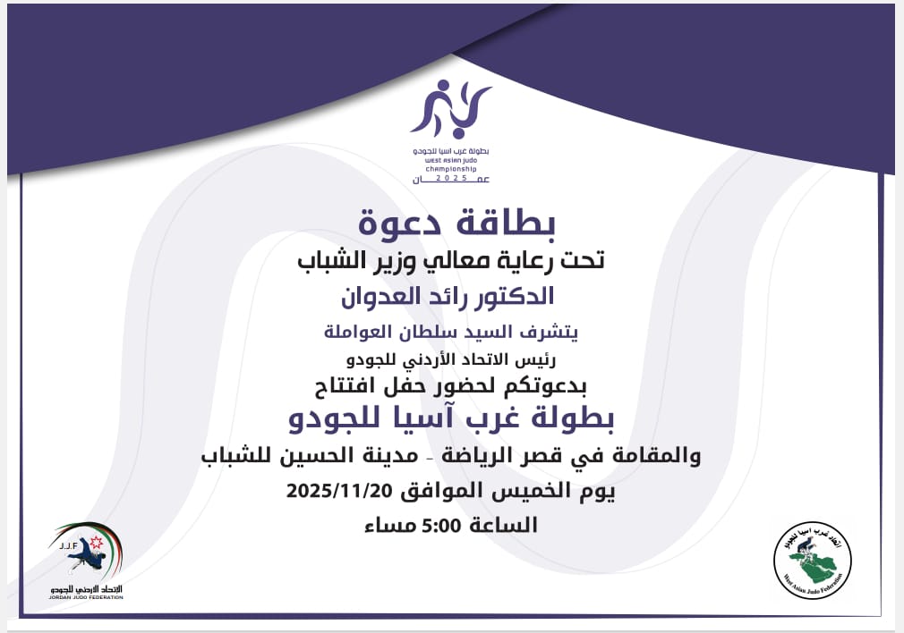 ‏ومن المقرر أن يشهد حفل الافتتاح حضور عدد من الشخصيات الرياضية والرسمية، إلى جانب وفود المنتخبات المشاركة، حيث تُعد البطولة محطة مهمة في روزنامة الاتحادين الأردني وغرب آسيا للجودو.