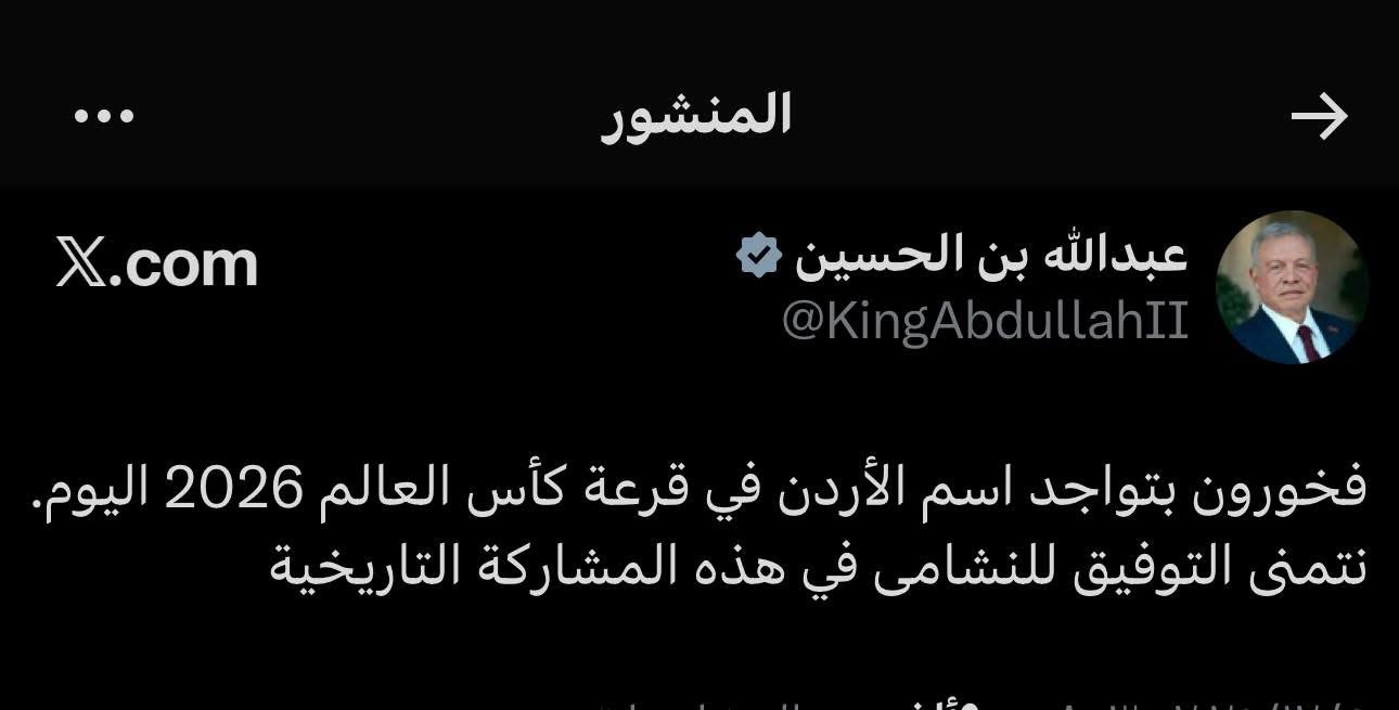 جريدة الملاعب - نشر جلالة الملك عبدالله الثاني منشورًا عبر منصة إكس عبّر فيه عن فخره بتواجد اسم الأردن في قرعة كأس العالم 2026 التي ستجري اليوم، مؤكدًا أنها لحظة تاريخية للكرة الأردنية. وتمنى جلالته التوفيق للنشامى في هذه المشاركة غير المسبوقة، آملاً أن يواصل المنتخب تحقيق الإنجازات ورفع راية الوطن في المحافل الدولية