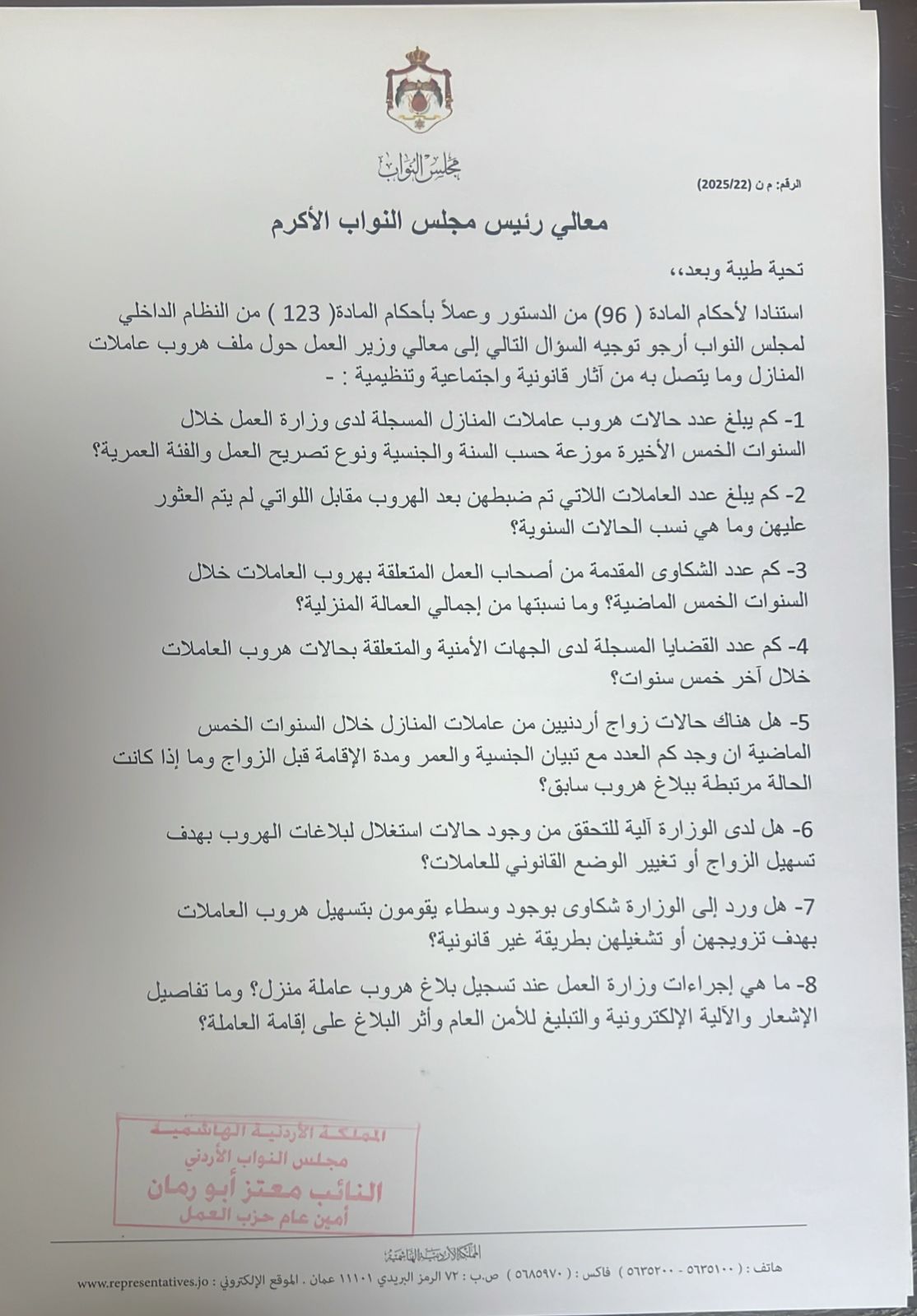 جريدة الملاعب - وجه النائب معتز أبو رمان سؤال نيابي إلى وزير العمل تضمن 17 بند حول ظاهرة هروب عاملات المنازل وما تحمله من تبعات قانونية وأمنية واقتصادية فيما ركز بشكل خاص على تزايد حالات زواج شباب أردنيين من عاملات منازل آسيويات هاربات محذراً من تحولها إلى مسار يستغل الثغرات القانونية ويغذي نشاط وسطاء وسوق سوداء آخذة بالاتساع.