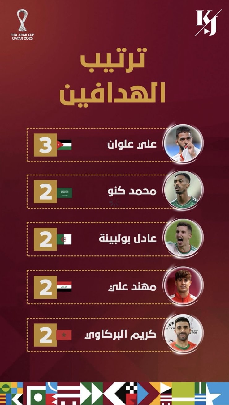 جريدة الملاعب - تصدر نجم النشامى علي علوان قائمة هدافي بطولة كأس العرب قطر 2025 بعدما رفع رصيده إلى 3 أهداف، ليصبح الأكثر تهديفًا في الجولة الحالية من المنافسات.