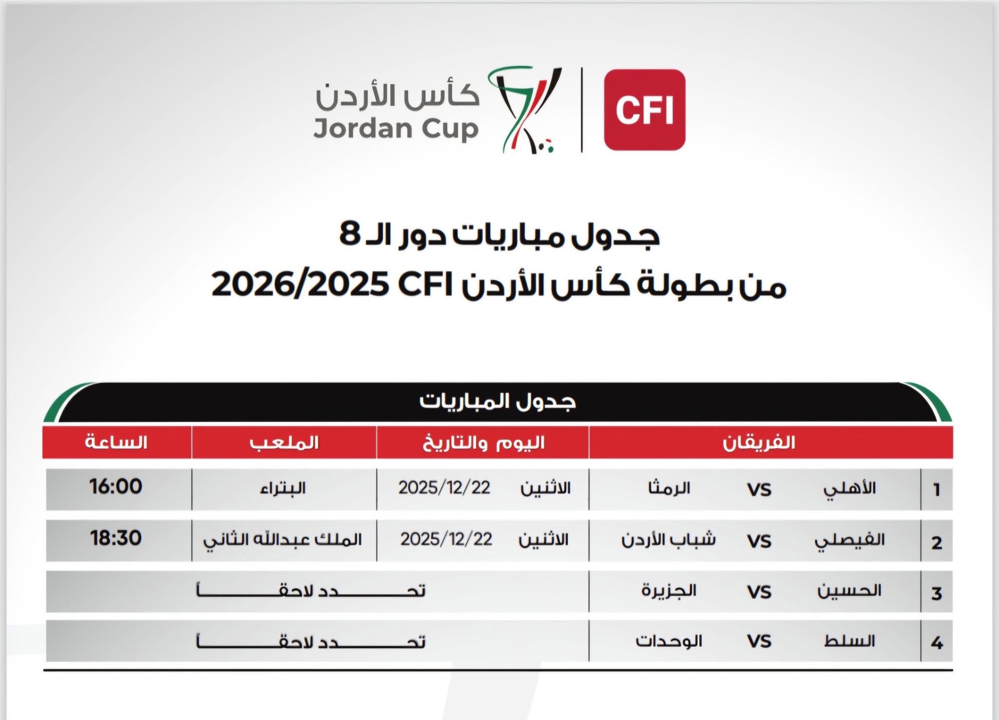 جريدة الملاعب - أصدر الاتحاد الأردني لكرة القدم، جدول مباريات الدور ربع النهائي لبطولة كأس الأردن CFI، لموسم 2025/2026.
