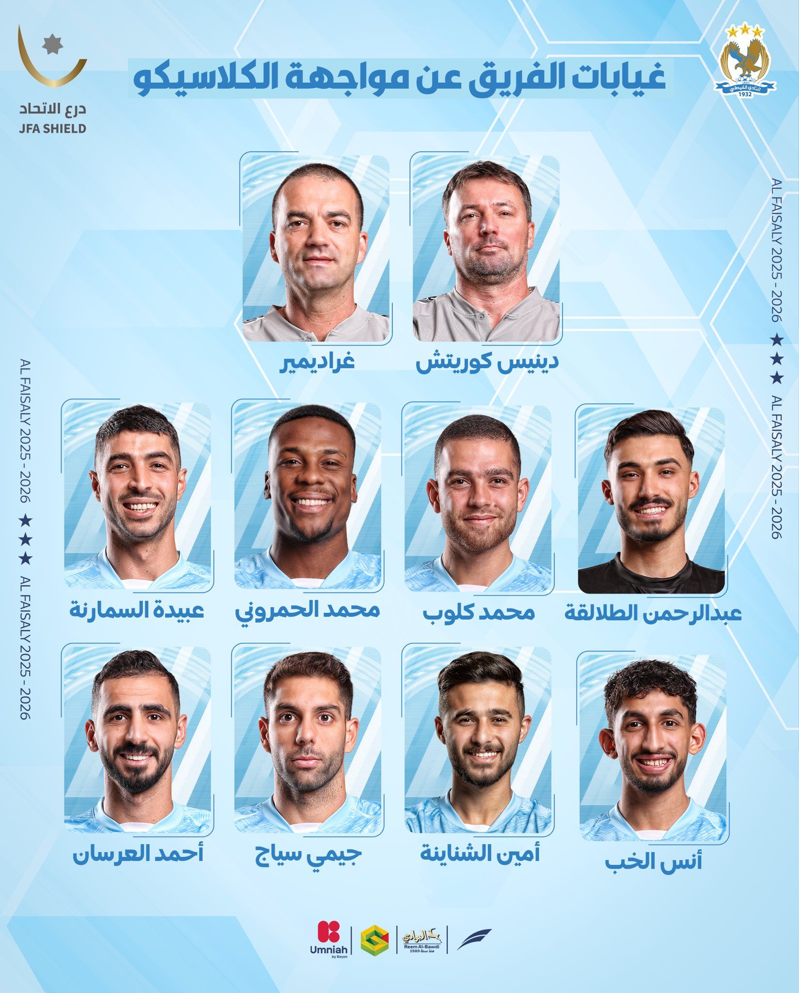 وسيغيب عن الفريق المدير الفني دينيس كوريتش ومساعده غراديمير بسبب سفرهما في إجازة، إلى جانب غياب عدد من اللاعبين وهم: عبدالرحمن الطلالقة، محمد كلوب، محمد الحمروني، عبيدة السمارنة، أنس الخب، أمين الشناينة، جيمي سياج، وأحمد العرسان.