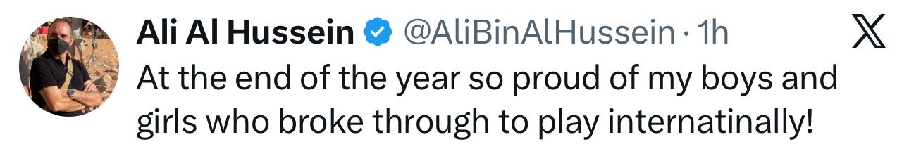 وقال سموه عبر حسابه الرسمي على منصة «إكس»: «في نهاية العام، أنا فخور جداً بأبنائي وبناتي الذين حققوا نجاحاً باهراً ووصلوا إلى اللعب على المستوى الدولي»، مشيداً بالجهود المبذولة التي تعكس تطور الرياضة الأردنية وحضورها المتنامي على الساحة العالمية.