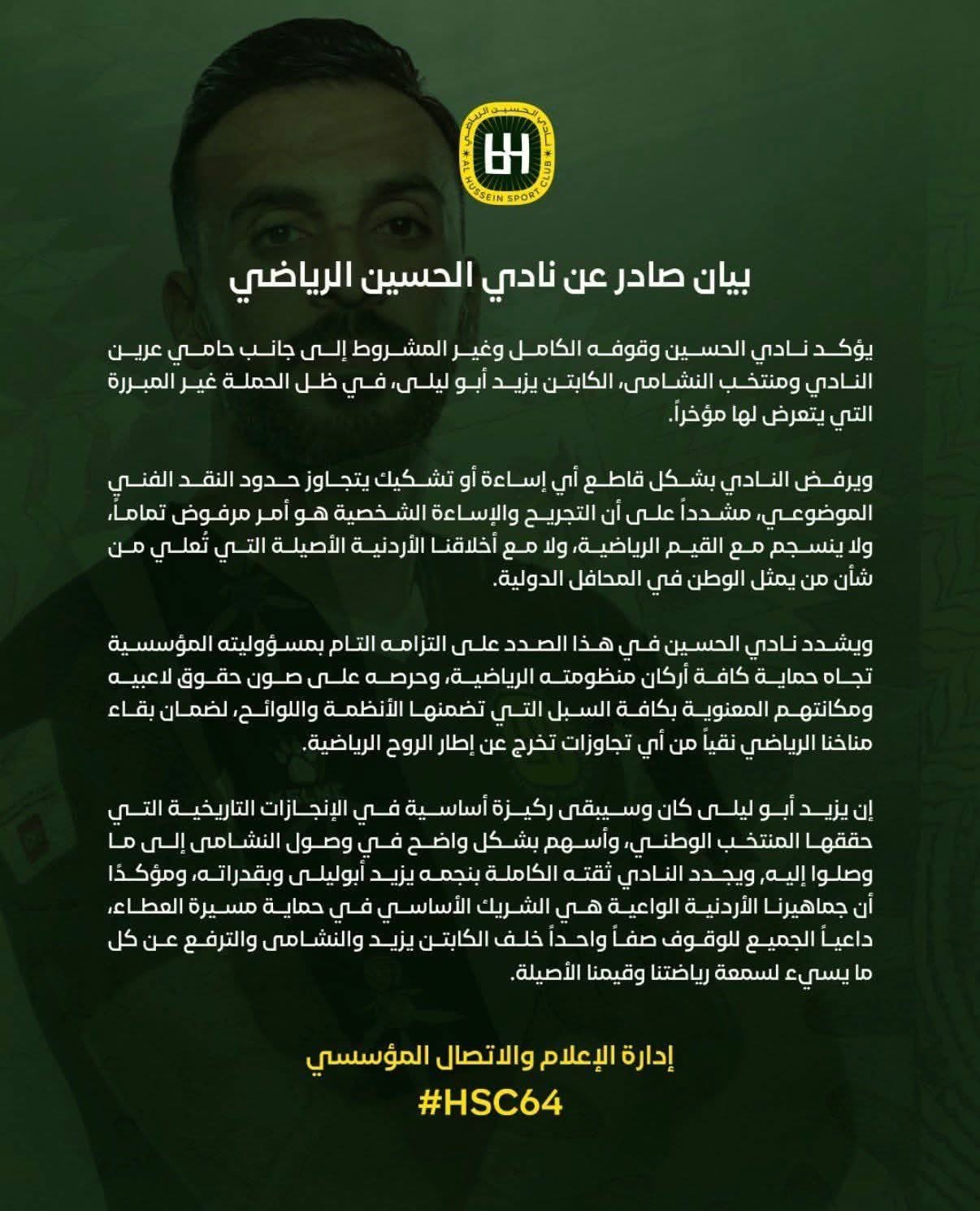 الصفحة الرئيسية رياضة محلية الحسين يُصدر بيانًا دعمًا لأبو ليلى ويرفض...