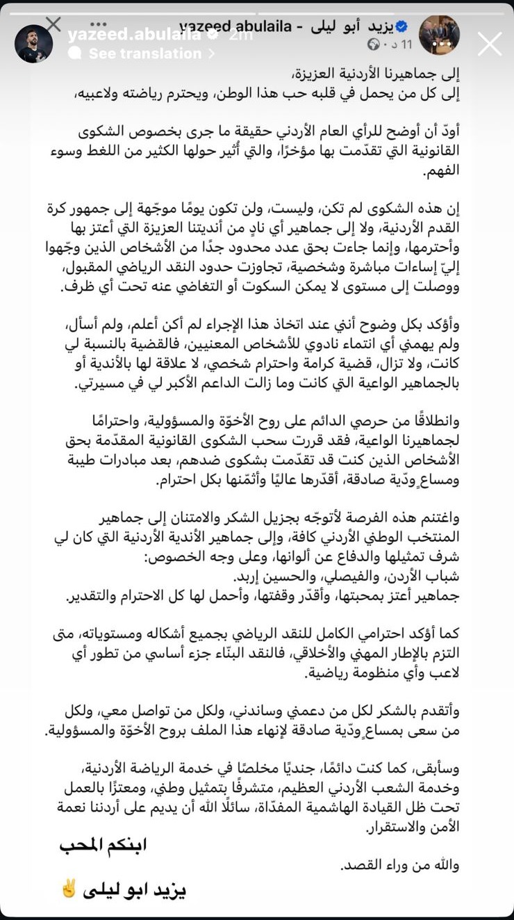 جريدة الملاعب - أصدر حارس مرمى المنتخب الوطني يزيد أبو ليلى بيانًا توضيحيًا وجّهه إلى الجماهير الأردنية، وضع من خلاله النقاط على الحروف بشأن الشكوى القانونية التي كان قد تقدّم بها مؤخرًا، والتي أثارت جدلًا واسعًا في الشارع الرياضي.