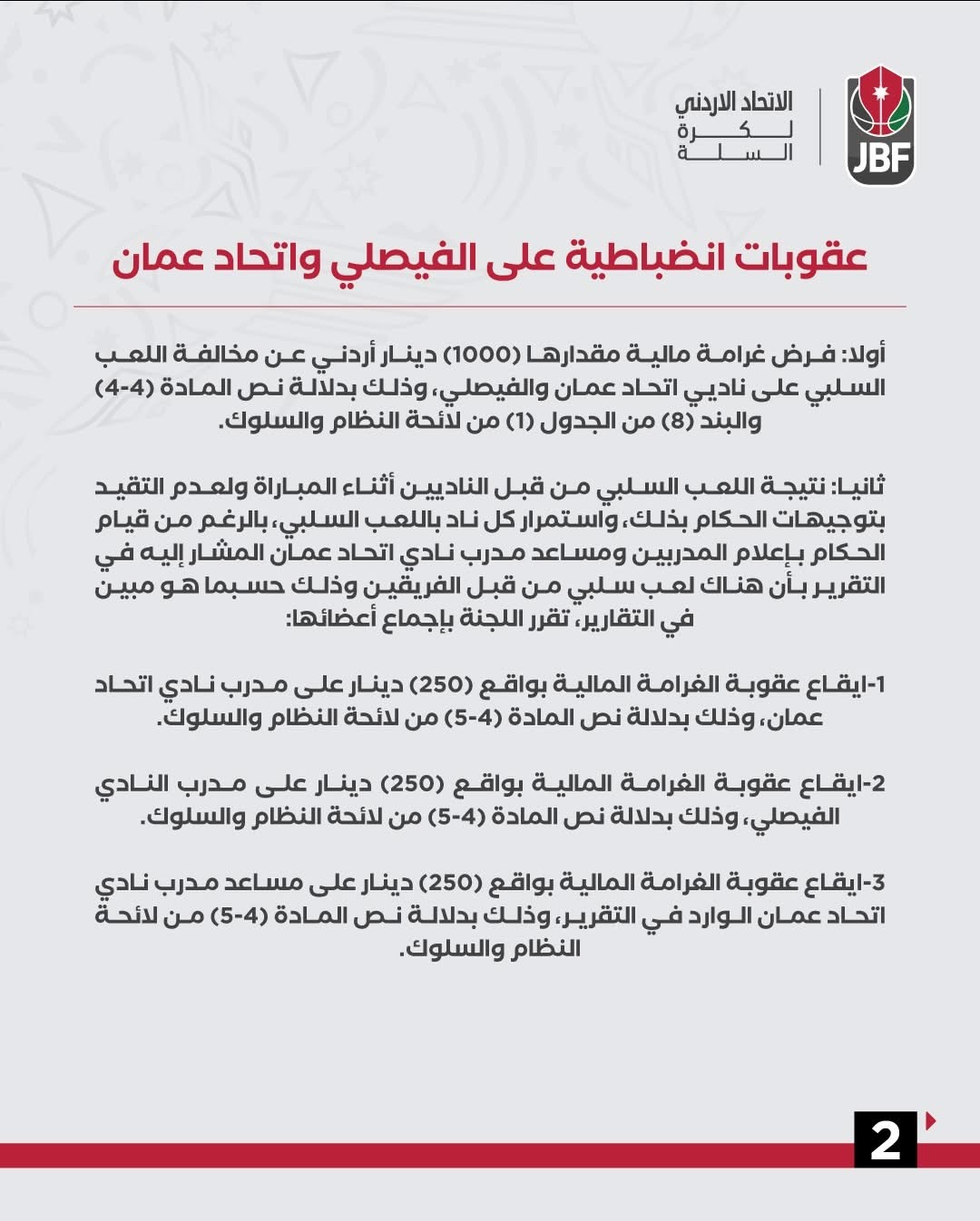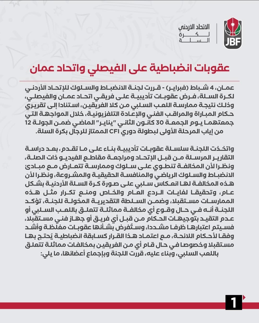جريدة الملاعب - أعلنت لجنة الانضباط والسلوك في الاتحاد الأردني لكرة السلة فرض عقوبات انضباطية على فريقي الفيصلي واتحاد عمان، على خلفية مخالفات تتعلق بـاللعب السلبي وعدم التقيد بتوجيهات الحكام، خلال المواجهة التي جمعت الفريقين ضمن الجولة 12 من دوري CFI.