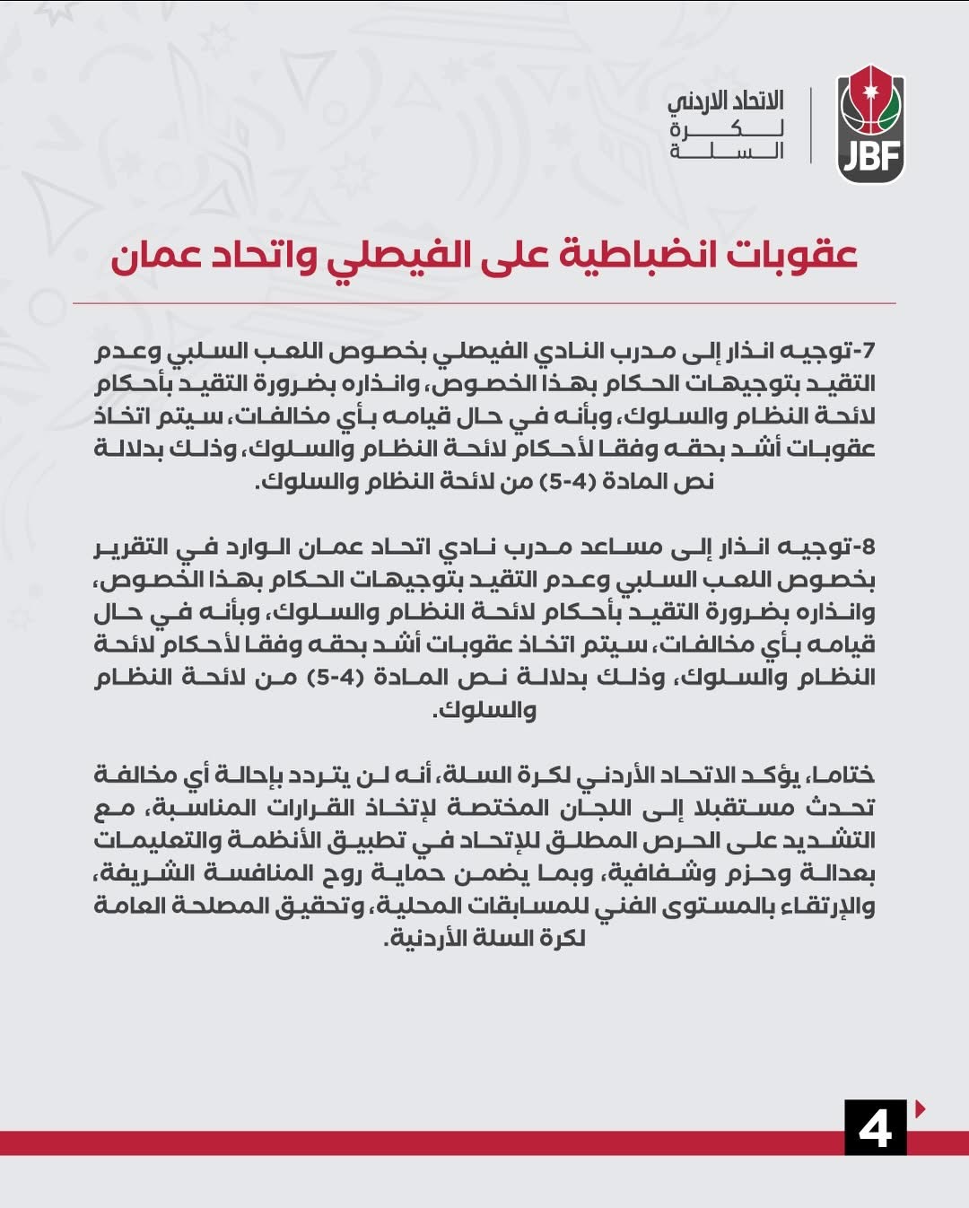 وأكد الاتحاد الأردني لكرة السلة حرصه على تطبيق القوانين بعدالة وحزم، بما يضمن حماية روح المنافسة الشريفة والارتقاء بالمستوى الفني للبطولات المحلية.