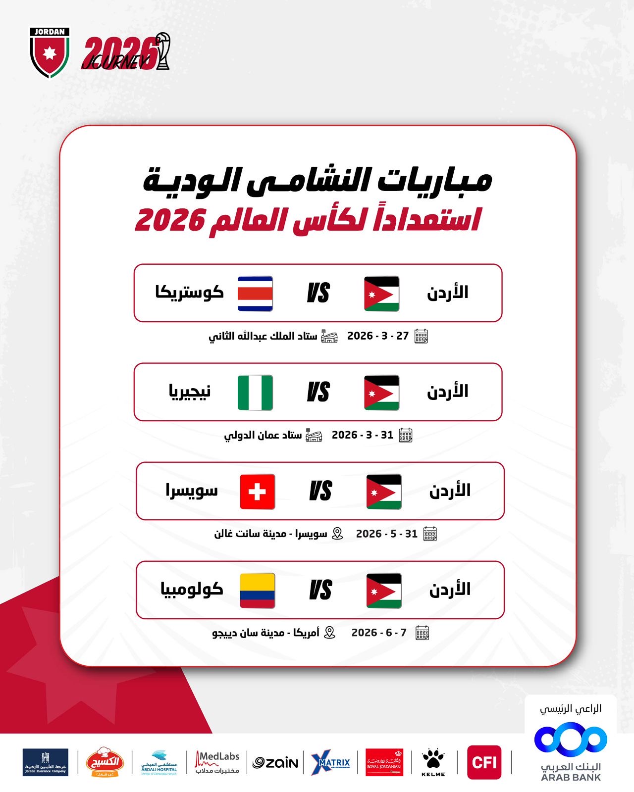 ويستهل “النشامى” مبارياته بمواجهة منتخب كوستاريكا يوم 27 آذار 2026 على ستاد الملك عبدالله الثاني في القويسمة، قبل أن يلاقي منتخب نيجيريا يوم 31 من الشهر ذاته على ستاد عمان الدولي.