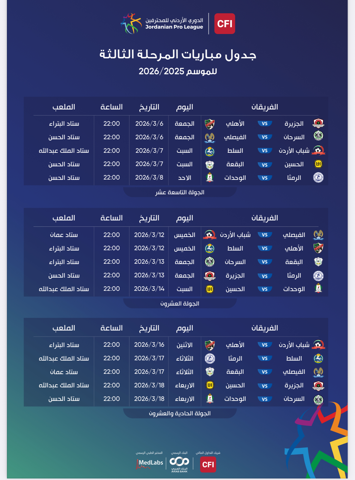 جريدة الملاعب - أصدر الاتحاد الأردني لكرة القدم، جدول مواعيد وأماكن إقامة مباريات الأسابيع من التاسع عشر وحتى الحادي والعشرين من بطولة الدوري الأردني للمحترفين CFI لموسم 2025/2026.
