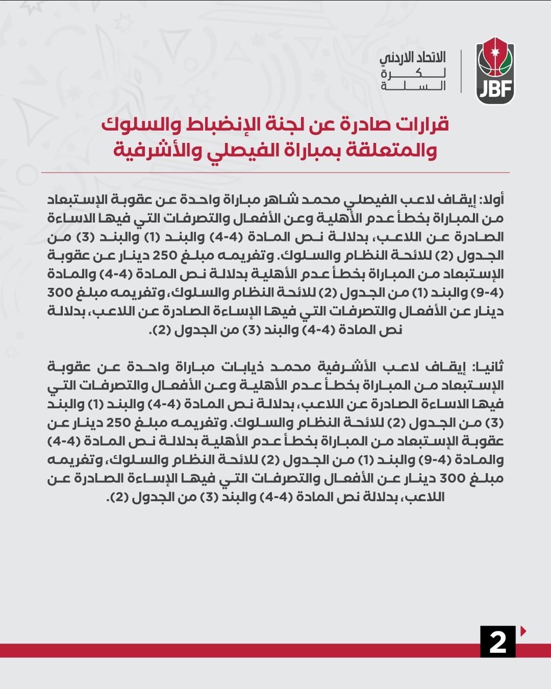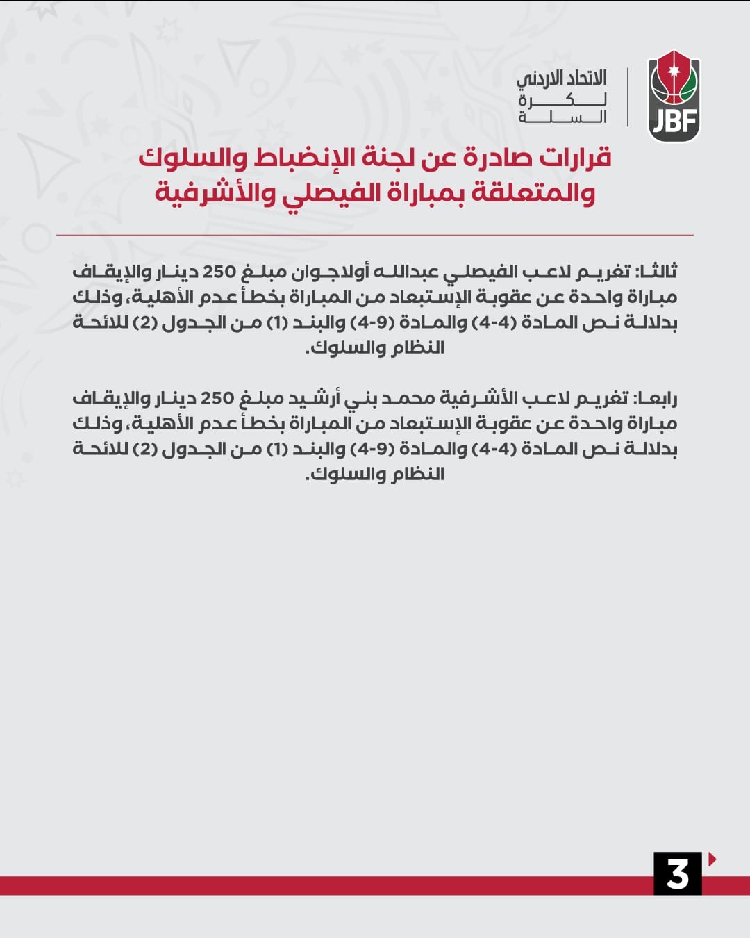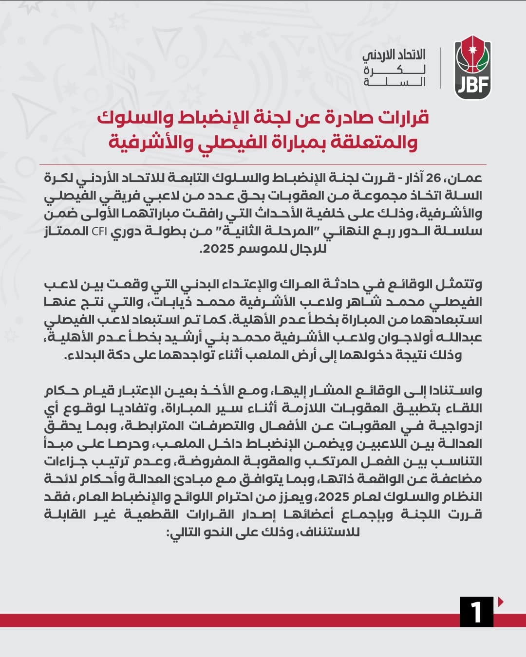 جريدة الملاعب - أصدرت لجنة الانضباط والسلوك التابعة للاتحاد الأردني لكرة السلة حزمة من العقوبات بحق عدد من لاعبي فريقي الفيصلي والأشرفية، على خلفية الأحداث التي شهدتها مواجهتهما الأولى ضمن سلسلة الدور ربع النهائي (المرحلة الثانية) من بطولة دوري CFI الممتاز للرجال لموسم 2025.
