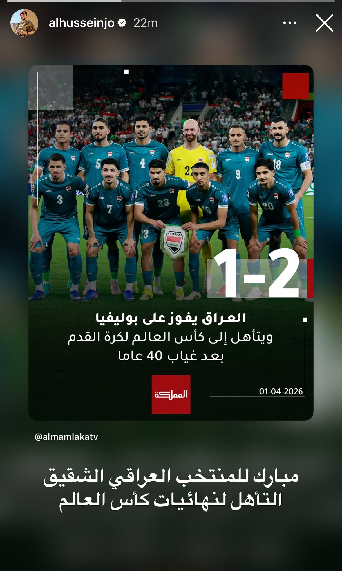 ونشر سموه عبر خاصية “الستوري” على حسابه في إنستغرام صورة مرفقة بعبارة: “مبارك للمنتخب العراقي الشقيق التأهل لنهائيات كأس العالم”، في لفتة تعكس الدعم والاعتزاز بالإنجاز العربي