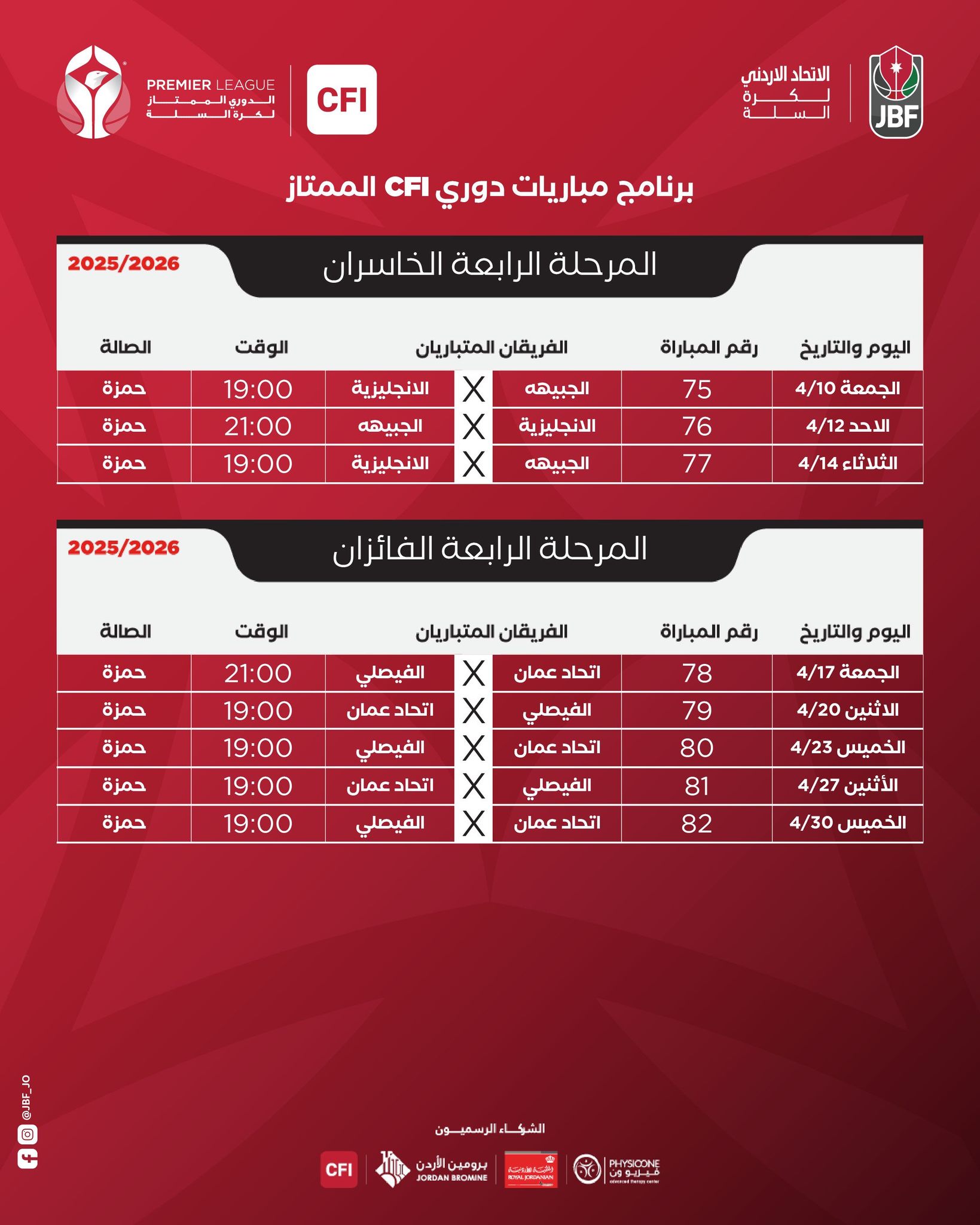 وتُقام جميع مباريات المرحلتين على صالة الأمير حمزة، وسط توقعات بمواجهات قوية ومثيرة تعكس مستوى التنافس الكبير بين الفرق الأربعة في ختام الموسم.