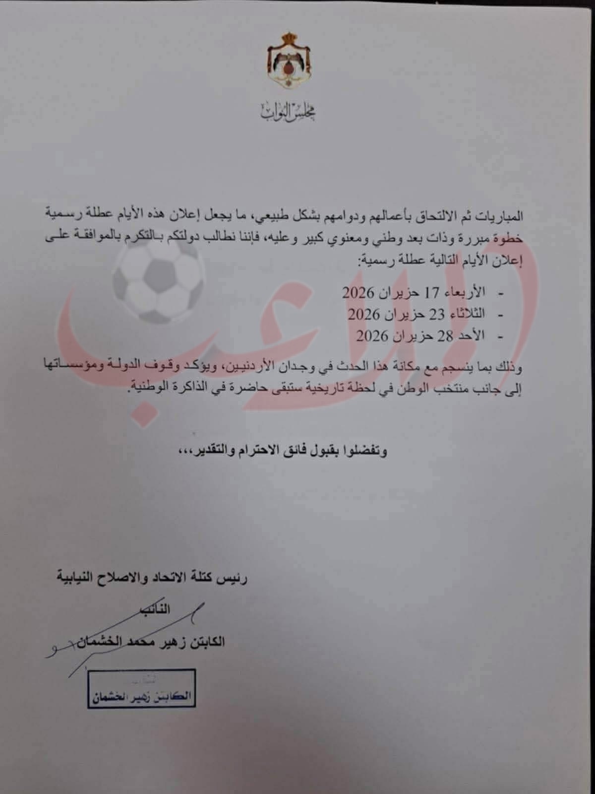 الخشمان يطالب بعطلة رسمية خلال مباريات “النشامى” في المونديال_وثيقة
