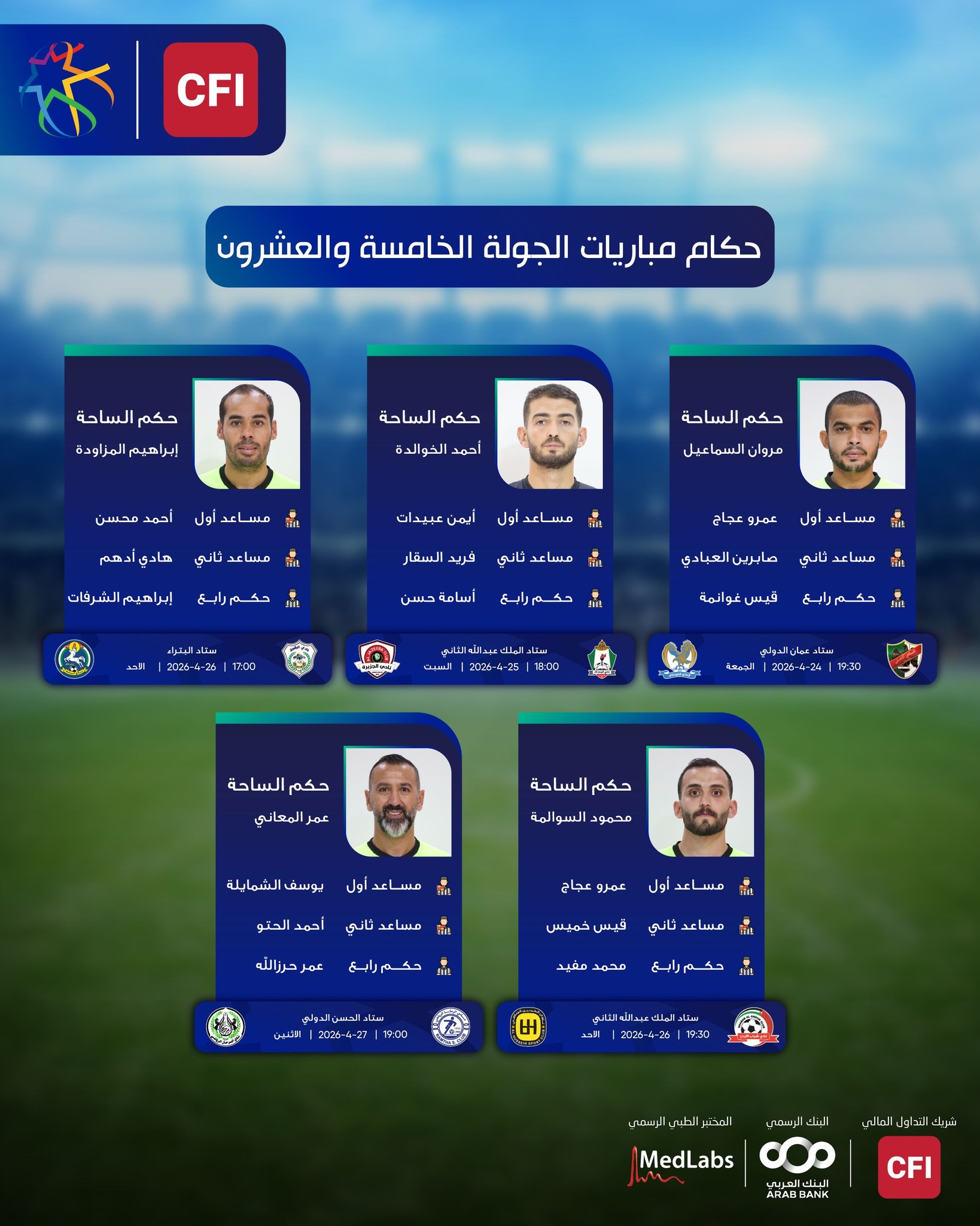 الكشف عن هوية الطواقم التحكيمية لمباريات الأسبوع الخامس والعشرون من الدوري
