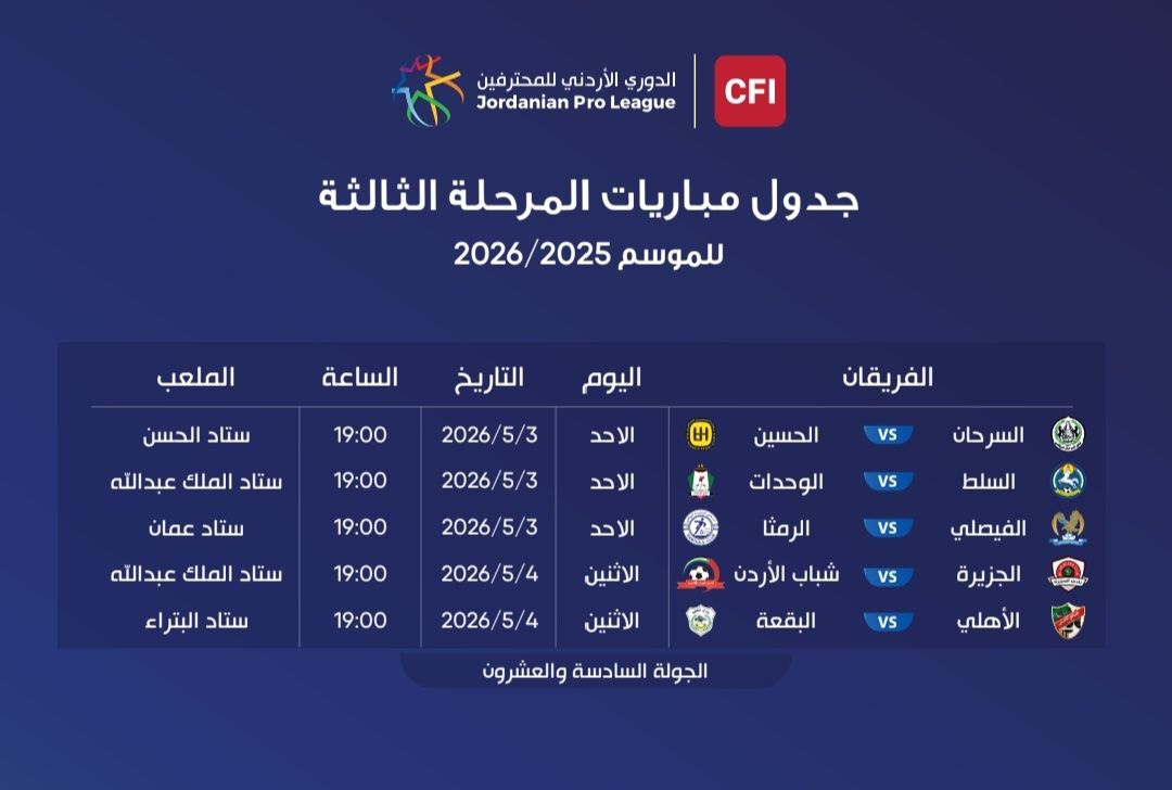 جريدة الملاعب - أصدر الاتحاد الأردني لكرة القدم، جدول مواعيد وأماكن إقامة مباريات الأسبوع الـ26، من الدوري الأردني للمحترفين CFI لموسم 2025/2026.